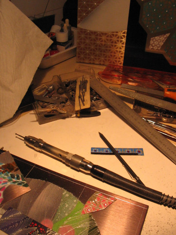 ALUGRAVURES ? L'APPROCHE EMOTIONNELLE : Une vision d'ailleurs nés dans le désordre jouissif de l'atelier. Le mariage entre les formes « alugravées », ou la dissidence entre elles pour une promenade dans le géométrique ou dans les silences de la tôle mue par les lumières.